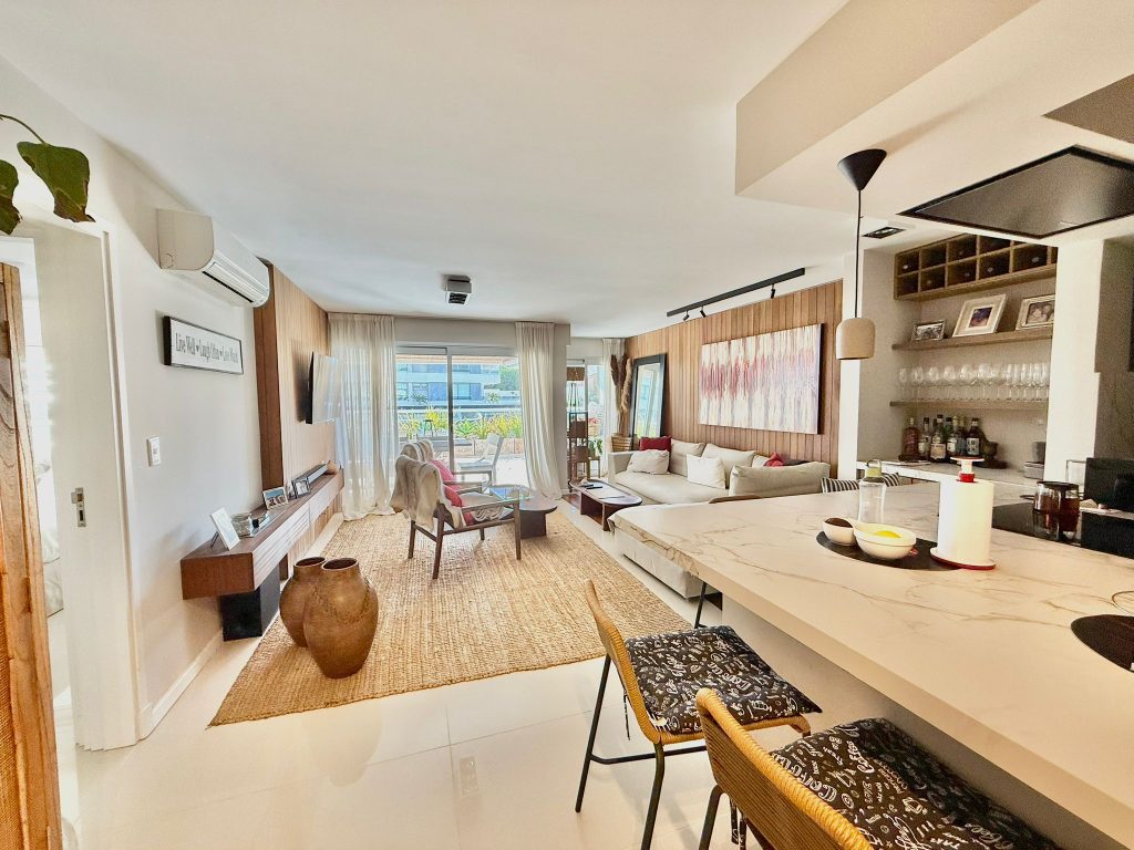 El apartamento cuenta con dos dormitorios y dos baños, uno de ellos en suite, y se entrega completamente equipado y decorado, listo para entrar a vivir. Ha sido reciclado con materiales de alta calidad, entre ellos una barra de cocina en Decton y terminaciones en madera Pacho, que aportan calidez y estilo moderno al espacio. La cocina está equipada con horno empotrado, anafe, campana de extracción y mobiliario funcional y contemporáneo.